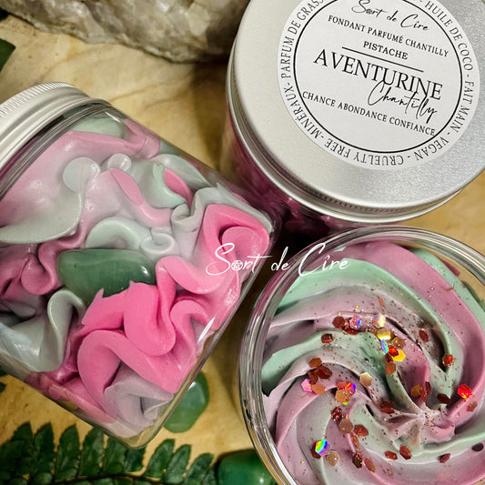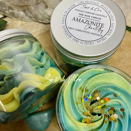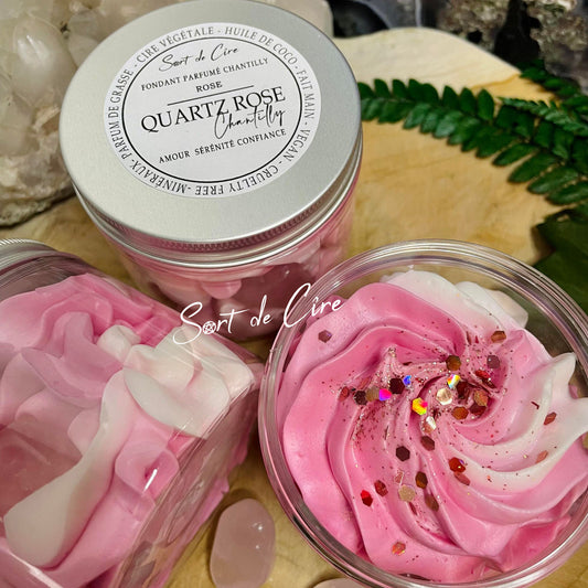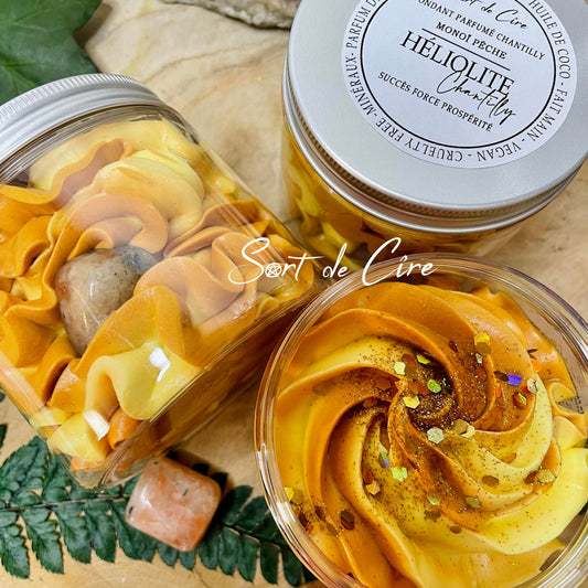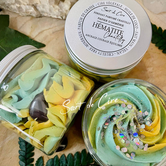 Plongez dans l'expérience enchanteresse de nos fondants parfumés, qui ressemblent à s'y méprendre à de la chantilly. Dans chaque pot, retrouvez un minéral de taille moyenne, soigneusement choisi pour amplifier l'énergie souhaitée et matérialiser vos intentions les plus subtiles. Un moment magique s'installe, éveillant vos sens spirituellement, visuellement et olfactivement. La cire en fondants, scintillant de mille feux, libère la magie de sa fragrance dans l'air, créant une atmosphère magique dans votre espace.